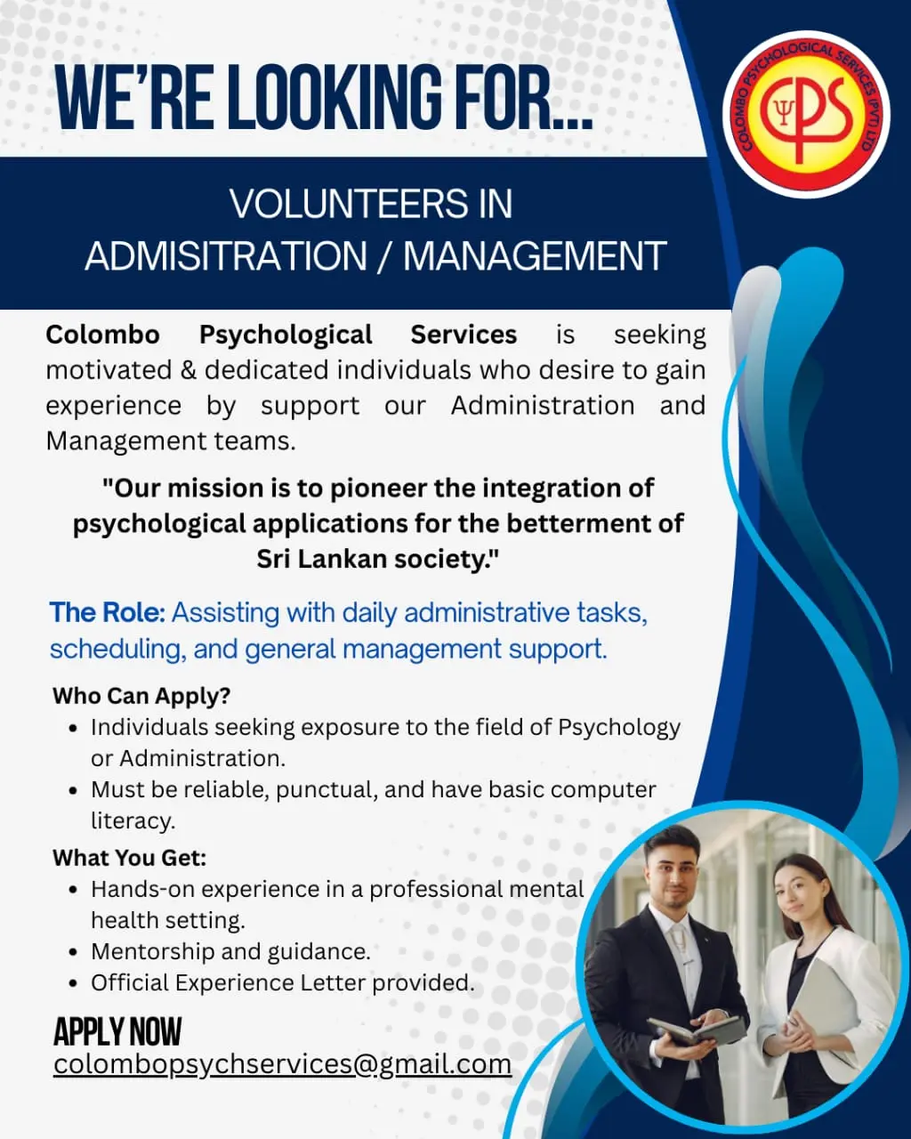 Internship opportunities and practical training are provided for counselling and psychology trainees by CPS. These arrangements will provide a solid basis for applying psychological principles in treatment and non- treatment modalities with strict adherence to ethical principles. Trainees will be personally supervised by a psychologist or a counsellor through out the period of the internship.